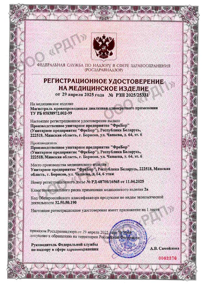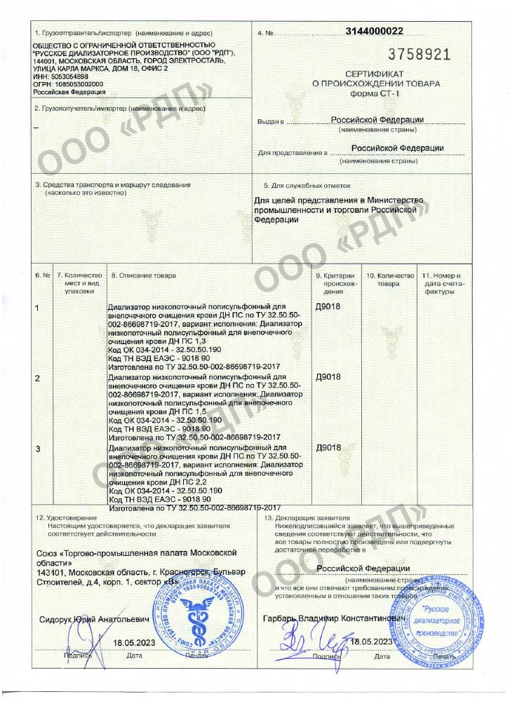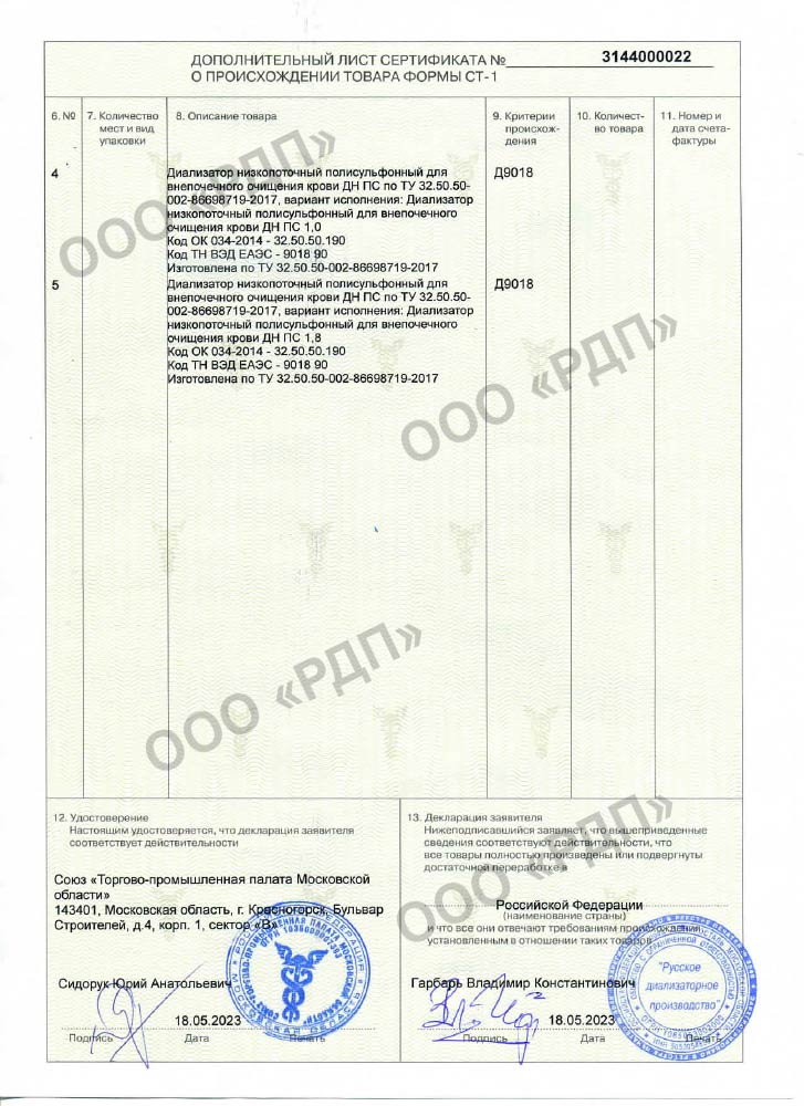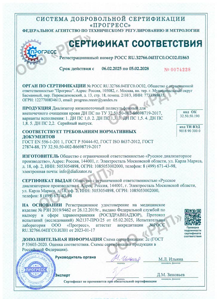 Гемодиализаторы - Главная Добро пожаловать.ООО "РУССКОЕ ДИАЛИЗАТОРНОЕ ПРОИЗВОДСТВО"Добро пожаловать.ООО "РУССКОЕ ДИАЛИЗАТОРНОЕ ПРОИЗВОДСТВО"Мы выпускаем низкопточные гемодиализаторы для внепочечного очищения кровиМы выпускаем низкопточные гемодиализаторы для внепочечного очищения крови ДИАЛИЗАТОРЫ с эффективной площадью поверхности мембраны 1,0; 1,3; 1,5; 1,8; 2,2 м2ДИАЛИЗАТОРЫ с эффективной площадью поверхности мембраны 1,0; 1,3; 1,5; 1,8; 2,2 м2ДИАЛИЗАТОРЫ с эффективной площадью поверхности мембраны 1,0; 1,3; 1,5; 1,8; 2,2 м2А также, ООО «РДП» поставляет линейку высокопоточных диализаторов ДВ производства Унитарного предприятия «ФреБор» (Республика Беларусь»)А также, ООО «РДП» поставляет линейку высокопоточных диализаторов ДВ производства Унитарного предприятия «ФреБор» (Республика Беларусь»)А также, ООО «РДП» поставляет линейку высокопоточных диализаторов ДВ производства Унитарного предприятия «ФреБор» (Республика Беларусь») Наша продукция сертифицирована Отзывы на нашу продукцию Наши гемодиализаторы проверялись ведущими клиниками. МОНИКИ Диализаторы ДН ПС могут быть рекомендованы к применению для лечения пациентов с терминальной почечной недостаточностью в медицинских учреждениях на территории Российской Федерации. ООО "РДП" показали высокую эффективность при проведении гемодиализных процедур и могут быть рекомендованы для применения в медицинских учреждениях на территории Российской Федерации. МСЧ МВД России Диализаторы ДН ПС ООО "РДП" показали свою высокую эффективность, безопасность и надежность и рекомендованы для применения в медицинских учреждениях на территории Российской Федерации. ГВКГ им. Бурденко Считаю использование диализаторов ДН ПС целесообразным и рекомендованным к использованию для стандартного диализа лечебных учреждениях МО и МЗ Российской Федерации. Расположение офиса "РДП" Вход в офис "РДП" ЭлектростальЯндекс.Карты — поиск мест и адресов, городской транспорт