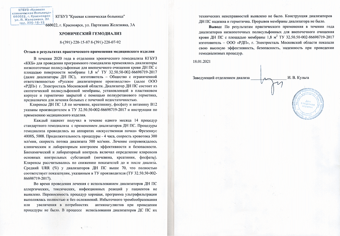 В течении 2020 года в отделении хронического гемодиализа КГБУЗ «ККБ» для проведения программного гемодиализа применялись диализаторы низкопоточные полисульфонные для внепочечного очищения крови ДН ПС с площадью поверхности мембраны 1,8 м2 ТУ 32.50.50-002-86698719-2017 (далее диализаторы ДН ПС), изготовитель - Общество с ограниченной ответственностью «Русское диализаторное производство» (далее ООО «РДП») г. Электросталь Московской области. Диализатор ДН ПС состоит из синтетической полисульфонной мембраны, установленной в пластиковом корпусе и герметично закрытой с помощью полиуретанового герметика, предназначен для лечения больных с почечной недостаточностью.